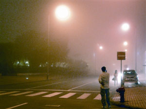 圖:皇朝區6日凌晨大霧,泛黃的霧燈下遠處一片迷茫。(圖片來源:澳門日報)