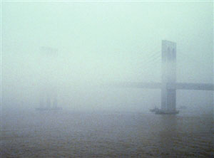 圖:西灣大橋被霧靄包圍,如從中“斷開”。(圖片來源:澳門日報)