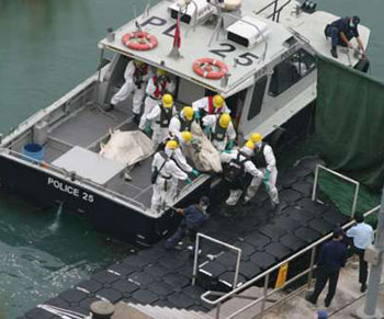沉沒36天的烏克蘭補(bǔ)給船“Neftepaz-67”,日前被海上大力士“華天龍”號(hào)吊起后,搜索行動(dòng)隨即展開。警方災(zāi)難遇害者辨認(rèn)小組近百成員,戴上防毒膠袍及口罩,配備手提電腦及大批搜索工具,聚集大欖水警基地,由多艘小艇送往大小磨刀洲現(xiàn)場,由28日凌晨搜索至28日晚上9時(shí)。
