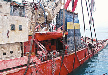 “等沉船完全可以自浮之后,再對整條船做一次完全檢修,就可以拖回廣州處理了!毕⑷耸坑址Q,如果檢修之后船身仍然不能自浮,就需要將整艘船吊起,用其它船只運走。