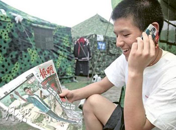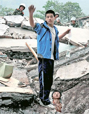 中新網5月22日電 據香港明報報道,地震災區無數震撼人心的真實故事分分秒秒上演,5月14日《明報》頭版照片在讀者中引起了極大震撼。該報記者特意深入地震災區,查訪兩名相中人的下落,21日終于在綿陽找到兩名北川中學高一學生——手托鹽水瓶協助救人的李陽,和被埋在瓦礫下的廖波。