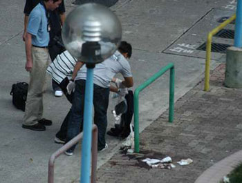 探員檢走中槍疑人的染血長褲。(圖片來源:大公報(bào))