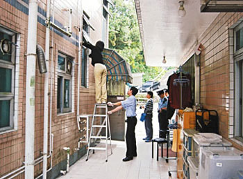香港警員在發生縱火案的村屋后門,模擬狂徒從后門氣窗投擲燃燒彈的過程。(圖片來源:文匯報)