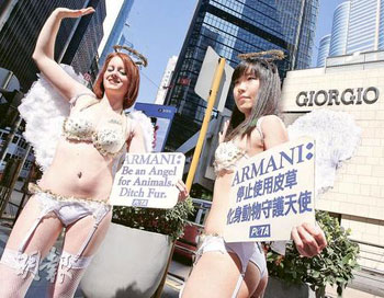 中新網11月26日電 據香港《明報》報道,慣以性感女郎進行抗議活動的“善待動物組織”,25日派出兩名僅穿內衣的“動物守護天使”,到香港中環置地廣場一間時裝名店外抗議。