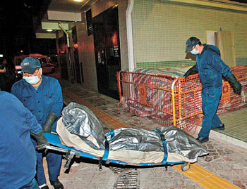 仵工將墮樓中大女生的尸體移送殮房。(圖片來源:蘋果日報(bào))