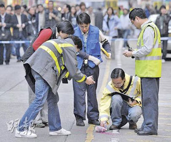 經(jīng)過4次拋擲膠瓶后,探員再將疑似通渠水的腐蝕液體淋潑在馬路上,以測試腐蝕情況,化驗師記下資料后,洗街車及食環(huán)署清潔工立即清洗路面,并隨即解封行人專用區(qū)。整個重組過程花近1小時。
