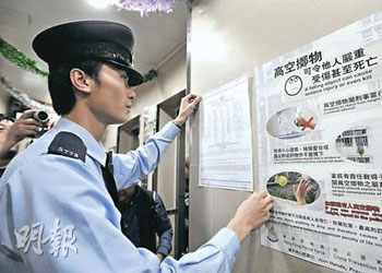 特區(qū)政府化驗師首先從大廈13樓天臺兩度拋下裝有透明液體的膠瓶,發(fā)現(xiàn)膠瓶均落在大廈對面近行人路位置。化驗師再拋下一個藍色液體膠瓶,落地位置一樣。及后眾人借用大廈6樓一單位,拋下一個紅色液體膠瓶,發(fā)現(xiàn)膠瓶落在馬路中心。每次拋擲膠瓶后,化驗師都會將液體四濺位置仔細記下,再度尺計算膠瓶與大廈的距離。