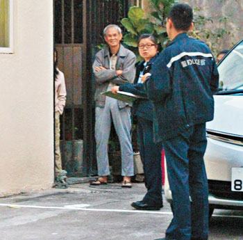 男戶主陳通美(左)走出單位協(xié)助調(diào)查。(圖片來源:蘋果日報)