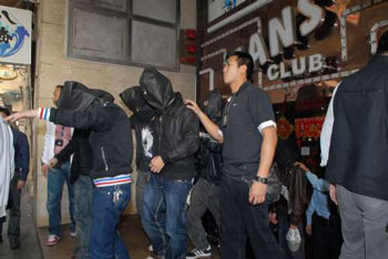 警員進(jìn)入酒吧后實(shí)時(shí)控制場(chǎng)面,繼而展開(kāi)搜查,在店內(nèi)3間貴賓房?jī)?nèi)先后搜出3把用紗布纏著刀柄長(zhǎng)近3呎的開(kāi)山刀及3柄牛肉刀,拘捕40男女,用膠塑帶兩人一組綁著押上警車帶署調(diào)查。
