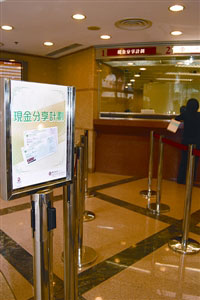 圖:銀行設置“現金分享計劃”兌票專窗。(圖片來源:澳門日報)