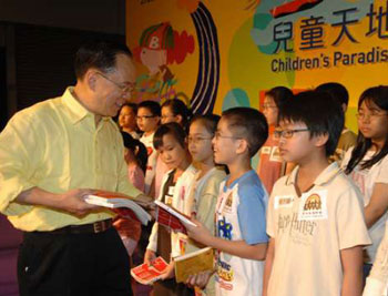 中新網7月28日電 據香港大公報報道,剛結束東北三省訪問的行政長官曾蔭權,昨天與18名兒童一同到香港書展看書,期間與他們暢談“開卷之樂”。