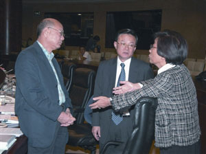 圖:曹其真、徐偉坤、鄭志強交換意見。(圖片來源:澳門日報)