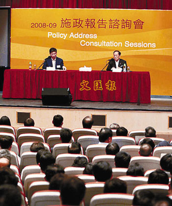 曾蔭權1日出席最后一次新年度施政報告發表前的地區咨詢,有百多名地區人士參加。他向與會者表示,香港未來需要解決3大問題,包括經濟發展、政制及民生問題,其中經濟問題仍將是首要考慮。