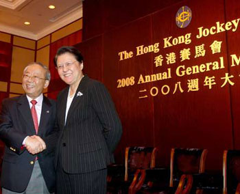 馬會4日舉行會員周年大會,遴選會員選出一名新任董事,另外5位董事獲選連任。現任董事郭勤功今年10月將屆70歲,因此決定退任。大會后,范徐麗泰獲選填補因郭勤功退休而騰出的空缺,任期2年。同時,陳祖澤和施文信分別獲連任馬會2008至2009年度主席及副主席之職。