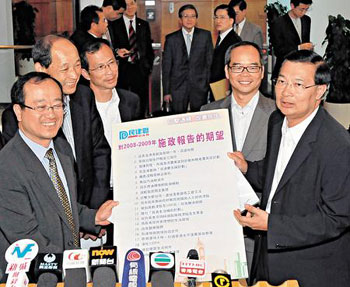 民建聯多位現任和候任立法會議員10日應曾蔭權邀請發表《施政報告》意見。譚耀宗說,特別向曾蔭權提出,在適當時間安排新一屆立法會議員到訪內地,例如到上海參觀世界博覽會,但沒有提及特定的時間表。