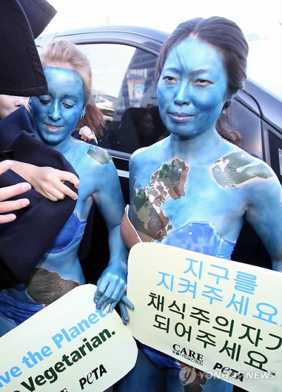 據稱,9日下午,“從倫理的角度對待動物的團體”成員加拿大人F某(24歲、女)和“愛護動物實踐協會”成員韓某(34歲、女)幾乎赤裸著身體在COEX附近舉行游行示威,呼吁人們只吃素食,不要吃肉。
