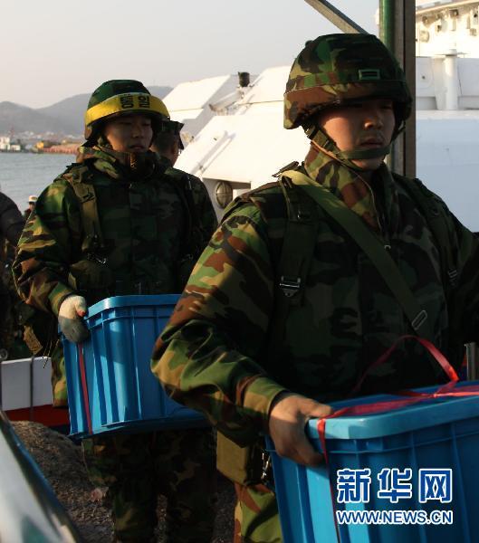 12月18日,在韓國延坪島港口,韓國海軍陸戰隊員搬運物資。韓國軍方16日宣布,韓國海軍將于本月18日至21日期間的某一天在延坪島海域舉行海上實彈射擊訓練。這一計劃令延坪島居民深感憂慮。 新華社記者 何璐璐 攝