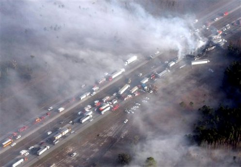 中新網(wǎng)1月10日電 據(jù)美國媒體報道,當?shù)貢r間1月9日清晨,由于美國佛羅里達州一條州際高速公路受灌木燃燒所造成的濃煙和大霧影響,造成大約70多輛汽車發(fā)生連環(huán)相撞事故。據(jù)當?shù)毓賳T稱,這起嚴重交通事故至少已造成4人死亡。