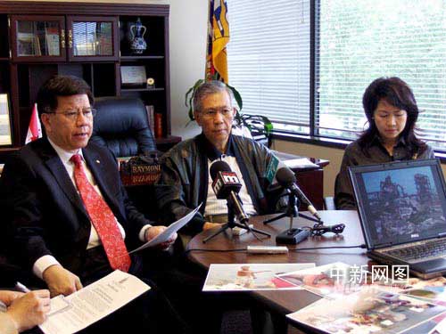 陳卓愉(左)一行從中國四川地震災區賑災歸來后在溫哥華召開記者會介紹所見所聞。