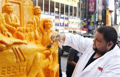 據路透社報道,7月4日,一位藝術家專門為美國獨立日創作的乳酪雕刻在美國紐約時代廣場上展出。這一新奇藝術品由重達一噸的乳酪制成,雕刻的內容是美國《獨立宣言》簽署時的情景。