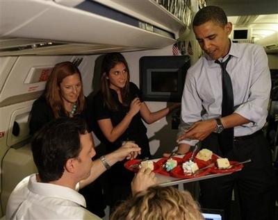 4日,奧巴馬在飛機上向隨行媒體人員派送生日蛋糕。