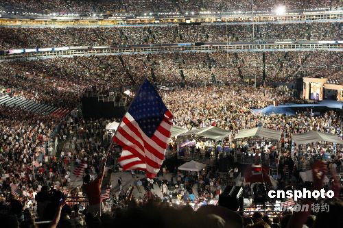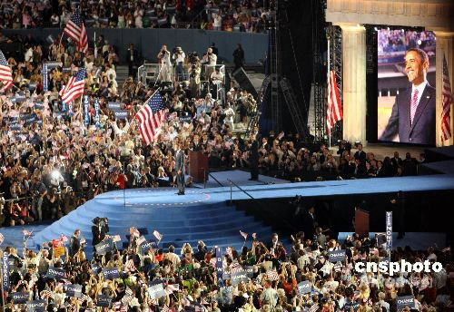 據“中央社”報道,奧巴馬是在極度興奮的七萬五千名支持者面前接受民主黨總統提名,成為有史以來獲得主要政黨提名的第一位黑人總統候選人。他獲得提名的時間正逢馬丁路德金博士發表呼吁種族和諧的演說《我有一個夢想》的四十五周年。