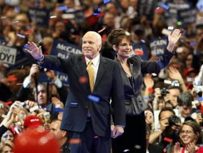 當地時間4日,麥凱恩和副手佩林在共和黨大會上向支持者揮手。