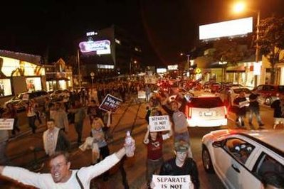 憤怒的人群擁堵在洛杉磯西好萊塢的同性戀聚集區,揮舞標語高喊口號,表達不滿。一位抗議者裸露的胸前寫著:我是八號提案的受害者!