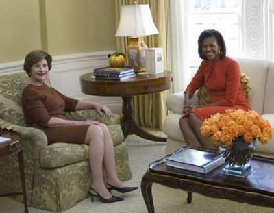 中新網11月11日電 據星島環球網報道,美國準第一夫人米歇爾10日隨同候任總統丈夫奧巴馬到訪白宮,趁著丈夫與總統布什進行會談的時候,在白宮范圍內到處逛逛看看,包括參觀他們一家兩個多月后便會入住的白宮行政大樓33個房間。為她充當向導的,是已經在白宮住了8年的現任第一夫人勞拉。