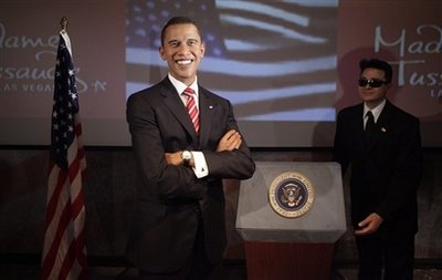 在美國紐約時代廣場的蠟像館,奧巴馬的蠟像正式與游客見面。奧巴馬的蠟像穿上深藍色西裝、配襯藍色的領帶及美國國旗襟章,雙手放在胸前,臉上掛有親切笑容,站在白宮總統辦公室布景中,造形神氣。