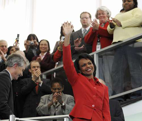 美國國務院十六日舉行了一場告別會,國務院全體職員均有出席。會上國務卿賴斯發表了一段主題為保衛全球自由民主的重要性的簡短演說。然后,她向下屬們說:“你們永遠都會留在我的腦海里、我的禱告里和我的心里。”當時她面露微笑,但眼里泛著淚光,而且說話的聲音哽咽。語畢,臺下向她報以熱烈的歡呼和掌聲,她則步下臺階,與各個大使、外交官、安全官員等逐一握手并拍照留念,然后步出大門。