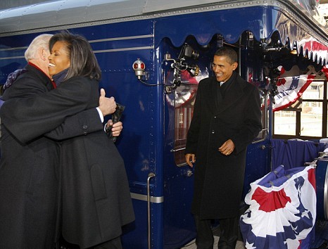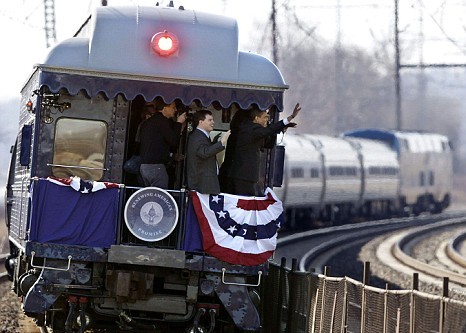 奧巴馬在乘坐專列由費(fèi)城啟程前往首都華盛頓途中,開始總統(tǒng)就職的一系列活動(dòng)。當(dāng)天也是其妻子米歇爾45歲的生日,他們?cè)诨疖嚿蠎c祝,兩人沿途又向群眾揮手,很多人夾道歡呼,有人舉起寫上“米歇爾生日快樂”的標(biāo)語牌。