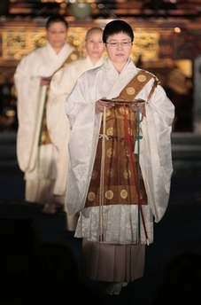 據悉,當天的這場時尚秀以動感hip-pop音樂為背景,約40名和尚和尼姑身著佛教八大流派的各色服裝進行展示。走秀的同時,僧侶們口中高聲誦讀經文,還不斷向空中拋灑代表蓮花瓣的五彩紙屑。