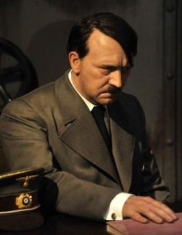 這尊蠟像塑造的是蘇聯紅軍兵臨城下后希特勒在自殺前的最后時刻。與其他蠟像不同的是,表情垂喪的希特勒坐在一張桌子后面(見圖)。蠟像館的人這樣安排,其用意是防止有人與希特勒蠟像合影,或者毀壞蠟像。