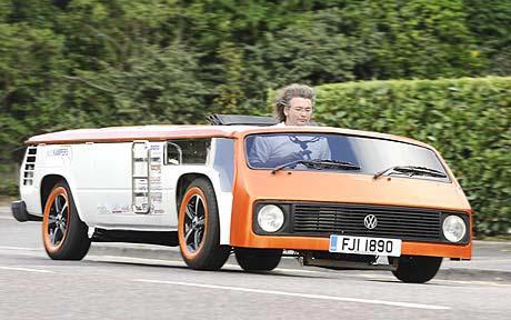 這輛露營車被命名為“敞篷蛋糕(Van-Cake)”,時速最高可達128公里/小時。桑德斯的團隊將原有大眾車1.38米高的頂棚切割掉,改裝成了一個35厘米高的頂棚。他們在車內放入新的操縱系統和低矮的座位。受制于空間,這輛車不是使用腳剎,取而代之的是手動剎車和變速桿;燃料槽也是經過特別制作的。目前已經取得合法上路的資格。由于這輛車非常矮,它可以輕松地從停車場柵欄下通過。