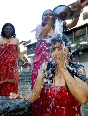 中新網9月5日電 綜合報道,9月4日是印度教傳統節日提吉節的最后一天。在尼泊爾加德滿都,印度教女子在河中沐浴,已婚的印度教婦女為自己的丈夫祈禱;未婚的少女們,則祈愿自己將來能找到一個英俊如意的丈夫。