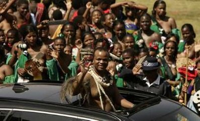 據(jù)香港明報(bào)報(bào)道,姆斯瓦蒂三世(Mswati III)穿著傳統(tǒng)服飾,趾高氣揚(yáng)乘著新款黑色開篷寶馬,率領(lǐng)長長的車隊(duì),在首都新建的國立體育館內(nèi)巡游一周,接受5萬觀眾的旗海歡呼。