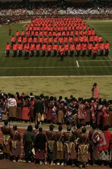 這場適逢國王40歲生日兼建國40年的“雙40”典禮,節(jié)目包括6萬佳麗的御前獻(xiàn)舞、打鼓表演、閱兵巡禮,以及在王太后御苑舉行的“花園派對(duì)”等。連同特別為今次活動(dòng)購入、用來接載國王等嘉賓的20輛豪華車、南非訂制的大蛋糕和宰殺120頭牛。