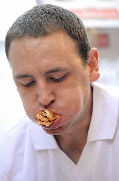 在O七年的美國國慶吃熱狗大賽中,切斯納特?fù)魯×诉B續(xù)多屆奪魁的日本著名“大胃王”小林尊,登上“大胃王”寶座。今年國慶,他又在十分鐘內(nèi)吃下五十九只熱狗,衛(wèi)冕成功。