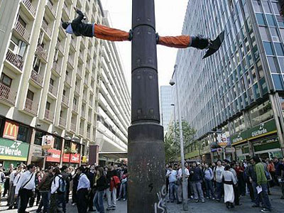 中新網10月16日電 綜合報道,智利魔術師Jean Paul Olaverry和Nicolas Luisetti以能使人漂浮在空中的魔術聞名。15日他們在智利首都圣地亞哥街頭再次展現拿手好戲,他們輕松的站上電線桿的兩側。