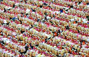 20日下午,數千人齊聚韓國首爾廣場,腌制出143噸韓國泡菜———堪稱世界上最大份的泡菜。這是一項慈善活動,泡菜將被分發給首爾的窮困家庭。