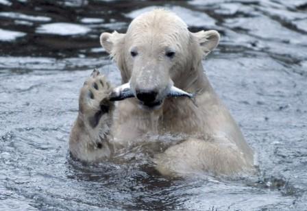 北極熊“克努特”12月1日在柏林動物園吃魚。