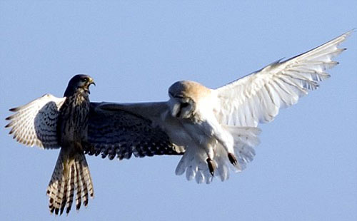 通常情況下,茶隼和貓頭鷹能夠和平相處,兩者并非天敵,而且一個在白天捕食,一個在夜間行動。茶隼攻擊貓頭鷹和貓頭鷹白天進行捕食的現(xiàn)象都不是正常現(xiàn)象。