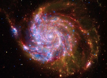 中新網(wǎng)2月12日電 據(jù)美聯(lián)社11日報道, 美國宇航局日前發(fā)布了“斯皮策”望遠鏡的紅外觀測圖像。圖像顯示,風車星系中心大范圍區(qū)域像藍色漩渦,而環(huán)繞星系的外圈卻呈現(xiàn)出奇特的珊瑚紅色。