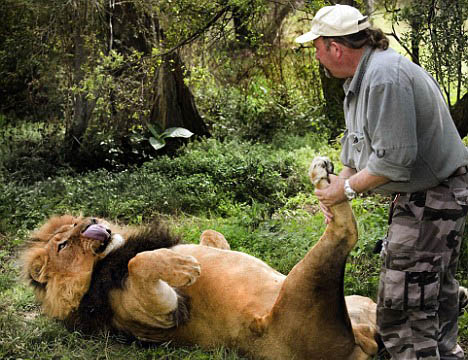 據(jù)英國(guó)《每日電訊報(bào)》報(bào)道,英國(guó)人亞歷克斯·勞倫提今年50歲,有兩個(gè)孩子。他在南非約憨內(nèi)斯堡附近的獅子公園里工作,負(fù)責(zé)照料75頭野性十足的獅子。和他關(guān)系最親密的是一頭叫賈穆的8歲雄獅。在照片上,他不但和賈穆?lián)ППВ為它按摩腳掌,賈穆看上去則十分舒適自在。亞歷克斯說(shuō),他花了6年時(shí)間才和賈穆達(dá)到目前的和諧關(guān)系。