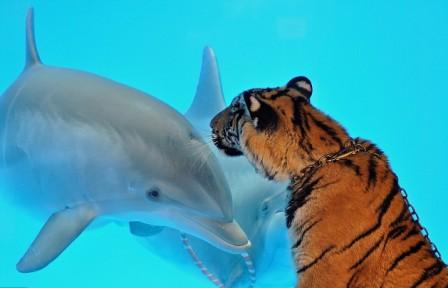 中新網(wǎng)3月7日電 據(jù)英國(guó)《每日郵報(bào)》報(bào)道,當(dāng)海豚遇上老虎?這樣的相遇似乎很少見,但是在美國(guó)加利福尼亞六旗探索王國(guó)游樂園,一只寬吻海豚竟然和一只孟加拉老虎一見傾心,海豚還以吐泡泡的方式向小虎問好。