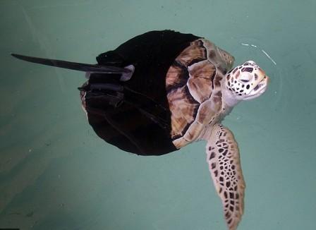 這只名為“艾里森”的綠海龜因遭鯊魚襲擊失去了一只鰭,隨后被送往德克薩斯州的海龜救助中心。當時研究人員認為它的傷勢嚴重,恐怕難以存活,但是它奇跡般地活下來了,并贏得了工作人員的愛心。一組研究人員用了幾個月的時間,為它設計了一個人造“義鰭”,但是可惜“艾里森”的殘鰭無法套上義鰭。最后科學家設計了一個可以蓋住小龜身體四分之三部分的“馬甲”,為小龜前行掌舵!鞍锷笨梢酝ㄟ^右鰭來改變方向。
