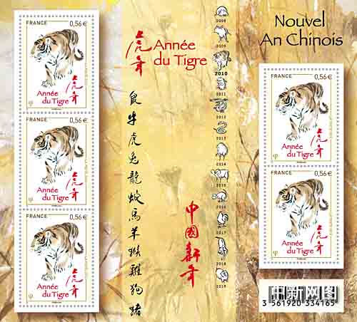 這是繼發(fā)行雞年、狗年、豬年、鼠年和牛年紀念郵票之后,法國第6次發(fā)行中國農(nóng)歷生肖紀念郵票。