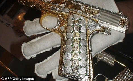 報(bào)道說(shuō),有3支沖鋒槍幾乎整個(gè)槍身都包覆黃金,并有一枝黃金制作的滅音器。一名顯然特別注重形象的幫派份子,他的手槍更是獨(dú)一無(wú)二,槍上鑲嵌了整排華麗的紅綠寶石和一個(gè)法拉利(Ferrari)徽記。