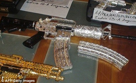 據(jù)報(bào)道,這些槍支顯示了幫派奢華份子如何花用他們不法的財(cái)富。照片顯示軍方在墨西哥西部一次突擊行動(dòng)中,起出31支槍?zhuān)蟛糠滞獗矶及仓S金或白銀外皮,或鑲嵌著許多閃閃發(fā)光的鉆石。